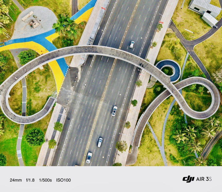 华侨公园天桥银带般优雅穿梭城市,曲线与直线相映,车流如跳跃音符,绿树草坪与金属光泽对比,是城市美学与便利的完美融合。