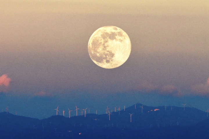 在海风吹拂的傍晚,远山与风车在月色下安静伫立。一轮明月高悬天际,照亮心中的思绪,也抚平了尘世的喧嚣。此刻,时间仿佛静止,只有风声与月光在山谷间低语。