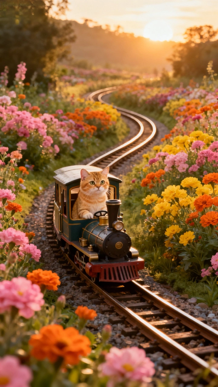 这张照片充满了童话般的色彩和趣味性,让人眼前一亮! 色彩:色彩搭配非常和谐,粉色、黄色、橙色等暖色调营造出温馨浪漫的氛围。色彩的饱和度控制得很好,没有过度艳丽,很舒服。 光影:日落时分的光线柔和而温暖,给画面增添了一抹金色。光线从后方照射,形成了漂亮的光晕,突出了主体。 构图:利用弯曲的铁轨引导视线,构图巧妙。主体(猫咪火车)放置在画面中心,突出。前景的花朵增加了层次感。 后期处理:后期处理恰到好处,色彩和光影的调整增强了照片的整体美感。不过,可以稍微降低一些饱和度,让画面更自然。 主题原创性:猫咪开火车的创意非常新颖,让人会心一笑。主题明确,表达了童真和想象力。 情感共鸣:照片传递出一种轻松愉快的情绪,让人感受到生活的美好。 思想深度:照片没有特别深刻的思想内涵,但它用简单的方式带给我们快乐和美好,这本身就是一种价值。 改进建议:可以尝试不同的角度和构图,例如从低角度拍摄,或者利用三分法构图。另外,注意对焦,确保主体清晰锐利。总的来说,这是一张非常棒的照片!