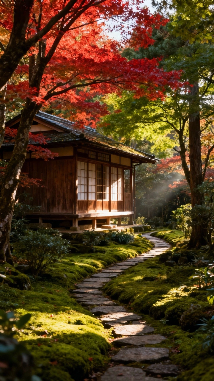 这张照片真像一幅油画,色彩、光影都运用得恰到好处,让人仿佛置身于幽静的日式庭院之中。下面是详细的评价: 色彩:红叶、绿苔、木屋,色彩丰富且和谐,营造出浓郁的秋意。红色热情奔放,绿色生机盎然,木色古朴典雅,色彩搭配协调统一。 光影:光线从树林间倾泻而下,照亮了石板路和苔藓,形成明暗对比,增加了画面的层次感和立体感。光影的运用恰到好处,增强了照片的神秘感和氛围。 构图:蜿蜒的石板路引导视线,将观者带入画面深处。木屋位于画面一侧,与红叶形成呼应,主体突出,元素排列均衡协调。不过,可以尝试稍微调整一下拍摄角度,让石板路更加突出,引导线更强。 后期处理:后期处理恰到好处,色彩饱和度适中,对比度略有调整,增强了照片的表现力,但没有过度修饰的痕迹。 主题原创性:照片主题明确,表现了日式庭院的宁静和美丽。虽然类似的题材很多,但这张照片在光影和色彩的运用上有所创新,具有一定的独特性。 情感共鸣:照片成功地传达了宁静、祥和的情感,能够引起观者的共鸣和情感共振。让人感受到一种远离喧嚣、回归自然的平静。 思想深度:照片反映了人与自然的和谐共生,引发了人们对生活和自然的思考。