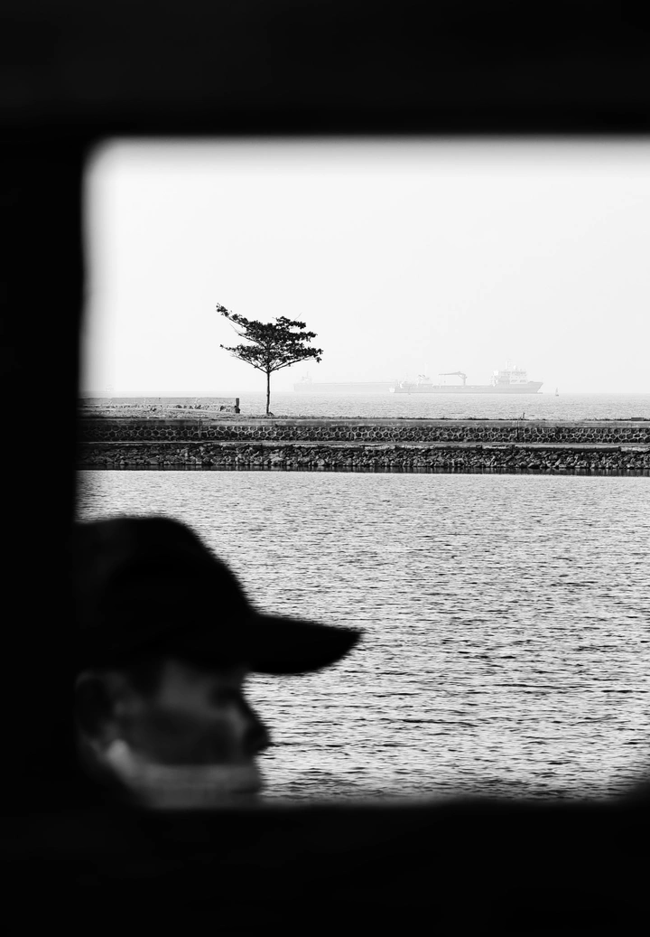 窗框切割出海与岸的轮廓,帽檐下的半张脸和孤树、远船一同,在述说着独一无二的故事!