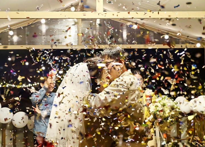 伴随着求婚的成功,礼炮和泡泡在空中飞舞,恋人在亲朋好友的祝福和欢声笑语中相拥在一起,这是属于他们的幸福时刻!
