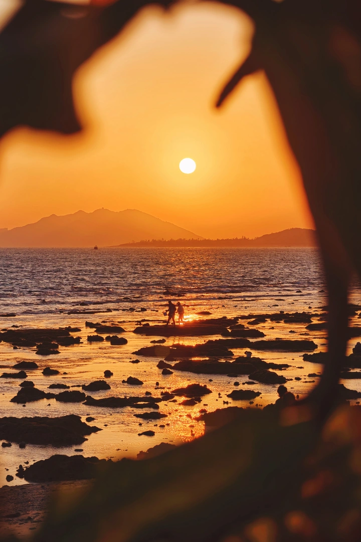 椰叶织成的天然画框里,橙红落日为海面铺就碎金,远处的城市轮廓在暮色里晕开,赶海的情侣在以前霞海中寻觅幸福,温柔了整个海岸黄昏。
