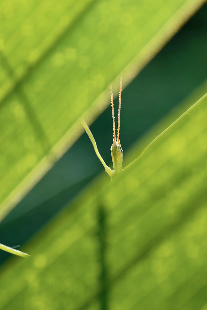嫩绿在叶片缝隙间,一只阳光下的小竹节虫在往里张望,细长倒影投射在叶片之上,就像在进行一场夏日的躲猫猫游戏。