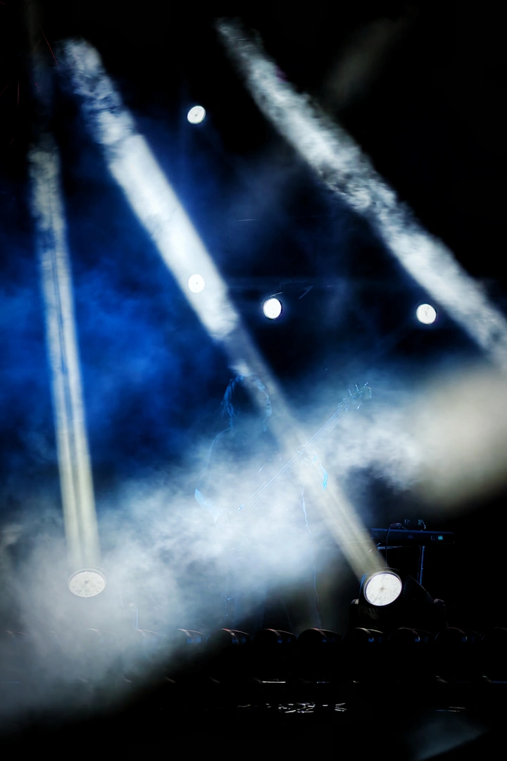 乐队演出现场,霓虹幻影、雾气弥漫,贝斯手在光柱间穿梭弹奏,尽情的享受着这舞台上的演出!