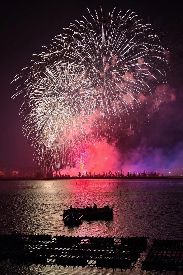漫天烟火在夜空炸开盛大的浪漫,水面浮台的钓者却在光潮里寂静独钓,享受这一场属于自己的盛大孤独。