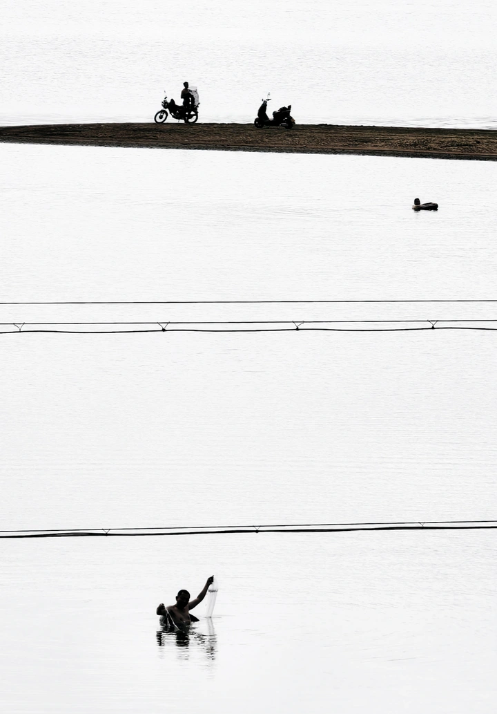 悠闲午后,小镇居民纷纷来到水库边捕鱼,画面捕捉到三个不同时段的渔夫状态:远处的刚到岸边,正准备下水;中间的已踏入水中,忙着放网;最前面的则在起网收鱼,共同构成了一幅生动有趣的生活画卷。