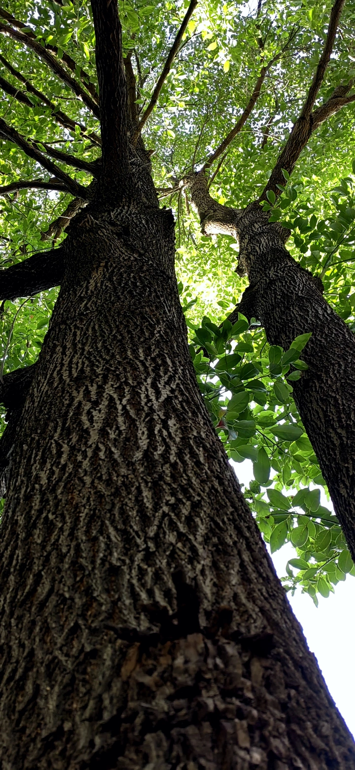 这两株香樟树,一大一小就近而生,亲密状态势同母子。香樟树是樟科樟属四季常绿大冠乔木,广泛分布于长江以南地区,以其独特的樟脑气味、优良的绿化价值和经济用途著称。
