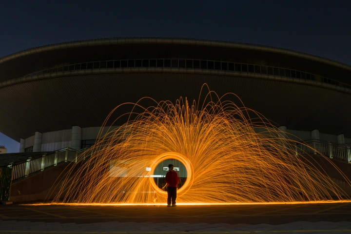暮色将城市晕染成靛蓝,巨大的穹顶建筑以冷硬的几何轮廓沉默伫立,如一艘停泊在夜空中的未来飞船。红衣创作者站在建筑前的广场中央,以燃烧的钢丝棉为画笔,在夜色里奋力甩动,瞬间迸发出千丝万缕的金色光焰。 这些炽热的光丝如流星坠落、似流火回旋,在建筑的冷峻线条间织就出一张温暖的光网。金属的冷冽与烟火的炽热在此刻碰撞,宏大的城市地标因这簇流动的光焰变得鲜活起来。光丝的动态轨迹被长曝光凝固成永恒的视觉诗行,每一道弧线都带着滚烫的生命力,在静谧的都市夜晚里跳动。 创作者的身影在光与影的交织中成为锚点,连接着现代建筑的科技感与光绘的烟火气,让冰冷的城市空间有了浪漫的温度。这幅作品不仅是光与影的游戏,更是人与城市的对话——当金属的火花在穹顶下绽放,我们看见的不仅是绚烂的光迹,更是平凡个体在宏大世界里,用炽热创造出的温柔回响。