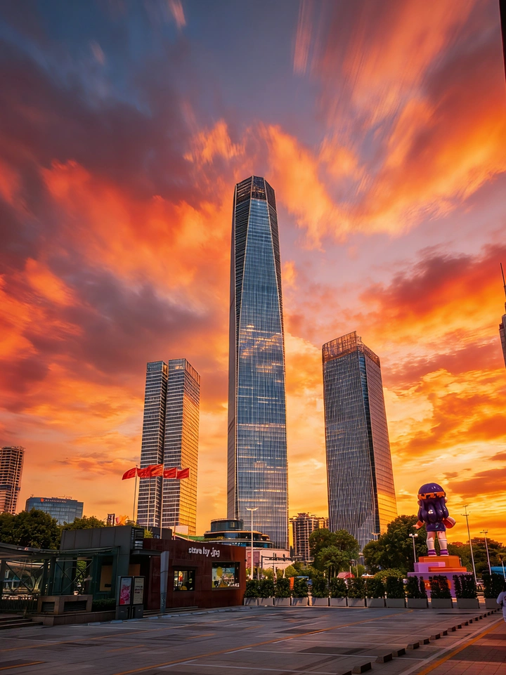 这张照片定格了东莞民盈·国贸中心建筑群在火烧云晚霞下的震撼瞬间。我以低角度仰拍,让摩天楼群与漫天熔金般的晚霞形成强烈视觉对话,云层的动态模糊处理为画面注入流动感,强化的建筑明度则让玻璃幕墙的质感与城市轮廓更显锐利清晰。 当炽热的橙红晚霞与冷峻的现代建筑相遇,坚硬的都市肌理被赋予柔软又浓烈的诗意,既展现了大湾区核心城市的蓬勃活力,也藏着自然天象与人类文明碰撞出的浪漫。我希望通过这帧画面,让观者在都市的喧嚣中,抬头看见属于城市的极致温柔——原来钢筋水泥的森林里,也能盛放如此绚烂的天空烟火。