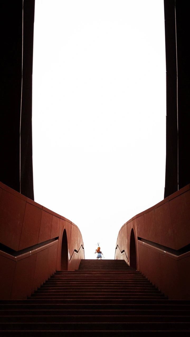 红色阶梯如一条通往未知的通道,两侧的建筑结构如沉默的守护者,将世界压缩成一条狭长的甬道。尽头的天空是纯粹的白,没有一丝杂质,而那个小小的身影,正向着这片空白坚定地走去。 我用低角度仰拍强化阶梯的压迫感,用色彩对比凸显人物的孤勇。这张照片想表达的,是在既定的框架里,依然选择向空而行的勇气——哪怕前路是一片空白,也要带着自己的色彩,走向更广阔的天地。