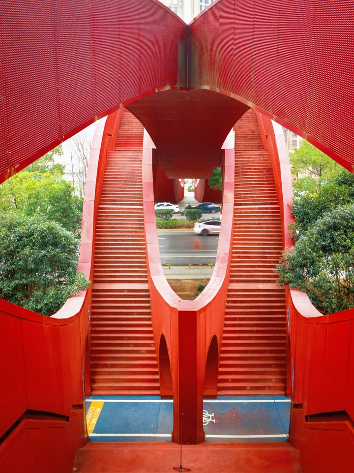 这是长沙梅溪湖的中国结步行桥,被评为“世界十大最性感建筑之一”。我以对称构图捕捉它的线条张力,饱和的红色如凝固的火焰,将阶梯引向天空,仿佛通往另一个维度的通道。桥身交织的结构像中国结般缠绕,既是城市的脉络,也是通往未来的隐喻。当车流在脚下穿梭,红色的阶梯在眼前延伸,我按下快门,定格这份建筑与自然、城市与梦想的对话。