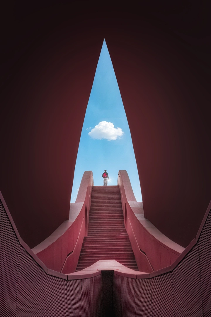 这张照片捕捉了城市建筑中一处极具张力的精神瞬间。暗红色的墙体如同一道厚重的屏障,在画面中切割出尖锐的三角形开口,将视线牢牢锁定在顶端的红色阶梯上。一个身影伫立在阶梯尽头,背对着镜头,面向澄澈的蓝天与一朵悠然的白云。 沉郁的红与明亮的蓝形成强烈的色彩对比,封闭的空间与开阔的天空构成了极具冲击力的视觉叙事。我试图通过这一构图,表达一种从束缚中挣脱、向未知前行的精神状态。阶梯不仅是物理的通道,更是内心向上的隐喻:当我们穿越眼前的“屏障”,便能抵达更辽阔的精神天地。 在城市的钢筋水泥之间,这样的瞬间提醒着我们:即使身处方寸之地,心也能向着那片云,向着无限的可能。