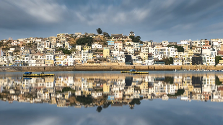 潮平岸阔,海水如打磨过的镜面,将半山的斑斓屋舍完整复刻,成就了一场现实与倒影的对称对话。长曝光下,流云舒卷成柔和的丝絮,为硬朗的街巷轮廓晕开几分诗意。 依山而建的民居层叠错落,暖白、浅黄与淡蓝的墙面在日光里交织,像一幅被海风晕染的油画。两艘彩船静卧水面,成为打破对称的点睛之笔,让凝固的风景多了几分烟火灵动。 我以镜头为媒介,定格这份山海间的静谧平衡。当岸与影在水中无缝相融,喧嚣被潮汐抚平,平凡的渔村日常,便化作了足以安放心灵的视觉诗篇。