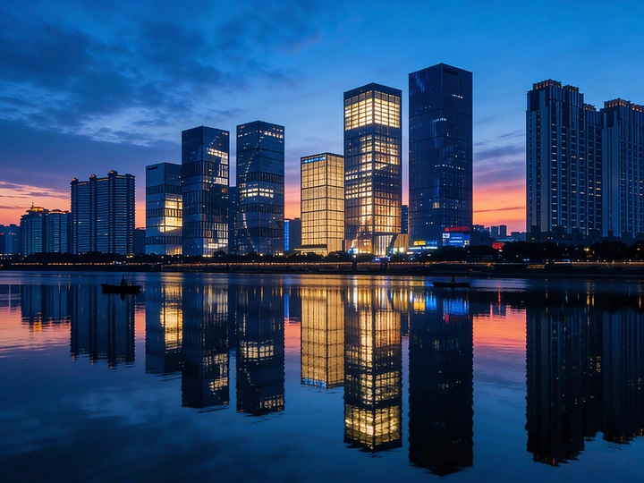 这张作品定格了城市蓝调时刻的极致浪漫,捕捉了日落后、夜幕完全降临前,独属于都市的黄金拍摄时刻。 作品以对称式构图构建起稳定的视觉秩序,上半部分是层次丰富的蓝调天空:深邃的宝蓝色从天际向上晕染,天边残留着日落褪去时的橙粉霞光,为冷冽的夜色晕开一层温柔的底色。林立的摩天建筑群以硬朗的线条划破天际,玻璃幕墙映着天光,楼体里次第亮起的暖黄灯火,是城市跳动的脉搏,在冷调画面中撕开温暖的缺口,形成强烈又和谐的冷暖视觉对冲。 平静的江面如同一面无痕镜面,将天空的霞光、建筑的轮廓与璀璨灯火完整复刻,虚实交织间,让画面的纵深感与氛围感拉满。水面上两艘轻舟的剪影,打破了镜面的沉寂,为恢弘的城市图景注入了灵动的烟火气,让冰冷的钢筋水泥有了人文的温度。 作品以精准的色彩与光影把控,将蓝调时刻的清冷与城市灯火的温暖相融,既展现了现代都市的恢弘气势,也捕捉到了繁华背后,城市独有的静谧与温柔,让观者在光影之间,触摸到都市夜晚最动人的浪漫内核。