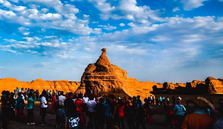 人文视角与自然景观形成对比,地质奇观雅丹地貌的壮美、天空的澄澈以及人文的鲜活很好地融合在一起,展现了自然造物的神奇,也传递出此地作为旅游胜地的活力。
