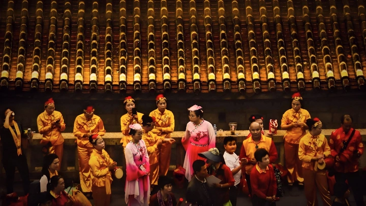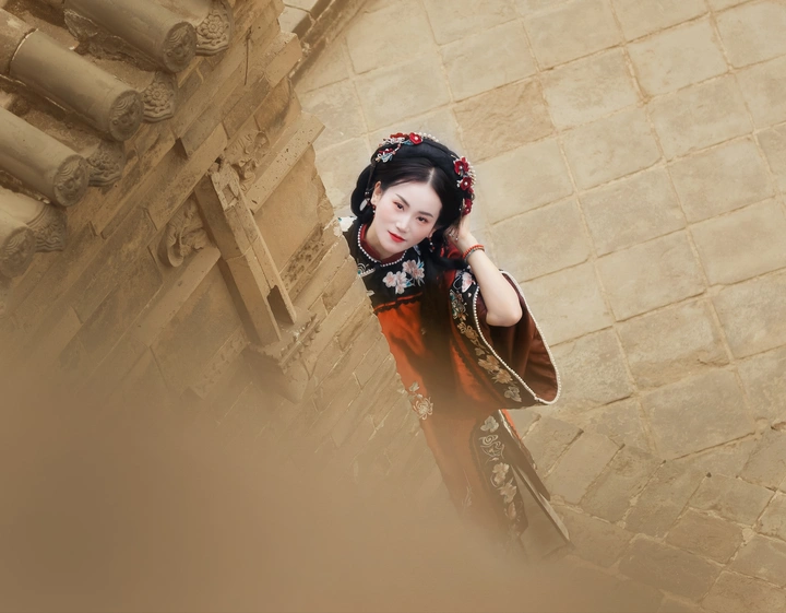 采用高角度俯拍,人物与古朴的砖石建筑形成几何化的画面分割,建筑的厚重感与人物的柔美姿态形成强烈对比,同时利用建筑边缘的线条引导视线聚焦于人物,让画面富有层次与张力。借由场景烘托出历史的厚重感,让我们直观感受到传统文化的美学魅力与历史底蕴。