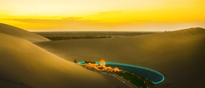 宽幅构图宛如躺卧的人体,沙漠的恢弘与人造物在大小上形成鲜明对比,建筑的彩色灯光增添了画面活力,自然与人文的和谐共存。1/25s, f/3.5, ISO800。