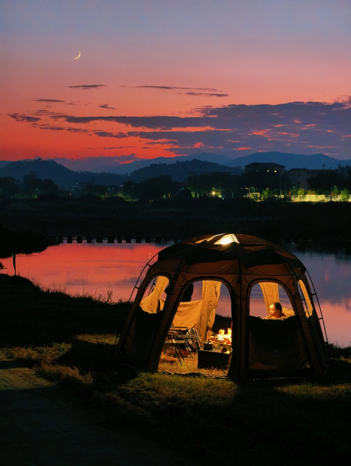 暮色温柔,残月如钩,橘红与蓝墨色的云在天空交织,似一幅未干的水彩画。远处的青山,在暮色中若隐若现,宛如守护大地的巨人。 溪畔边,一顶帐篷静静伫立,暖黄的灯光从帐篷里透出,在夜色中显得格外温馨。那是家的味道,是旅途中最温暖的港湾。 坐在帐篷前,听着溪水潺潺,感受着微风的轻抚,所有的疲惫都在这一刻消散。抬头望月,心中满是宁静与满足。 生活不只有眼前的苟且,还有诗和远方。这一晚,与自然为伴,与月光为友,让心灵得到最纯粹的放松。