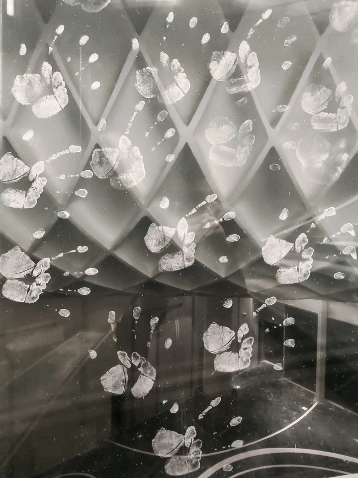 三万年前,原始人在岩壁上按下手印,为了证明"我来过"。 三千年后,工匠在陶器上留下指纹,为了标记"我造过";今天,工人在玻璃上印满手印,为了诉说"我参与过"。 从洞穴到工地,人类用最身体的方式与世界对话。这些白色手印,是时间的长河里,我们存在过的证据。