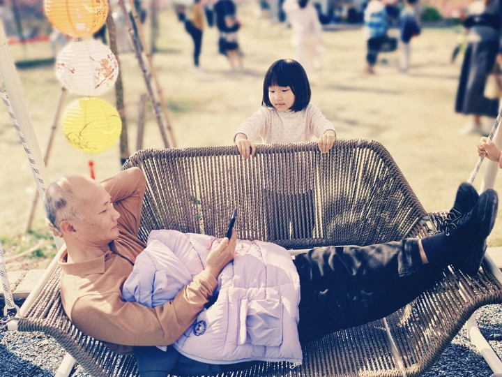 周末的公园里,阳光明媚。小女孩认真的推着摇椅,爷爷则悠闲得抱头看手机,身上还披着女孩的外套。这大概就是爱的传递,也是中式人伦之美。
