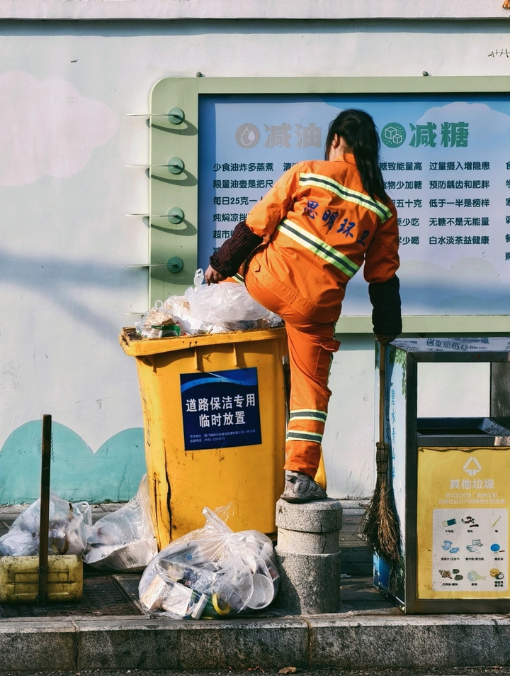 一个橙色的背影在夕阳下是那么鲜艳。一脚踩在石墩上,努力的将快要溢出的垃圾踏进桶内。 塑料袋的褶皱里,装不下人们白日的疲惫。 身后的“减油减糖”标语,和她手里的垃圾一样真实—— 有人在规划健康的生活,有人在收拾生活的残渣。 扫帚斜倚在垃圾桶旁,像她沉默的战友, 而她的背影,是这座城市最朴素的注脚。