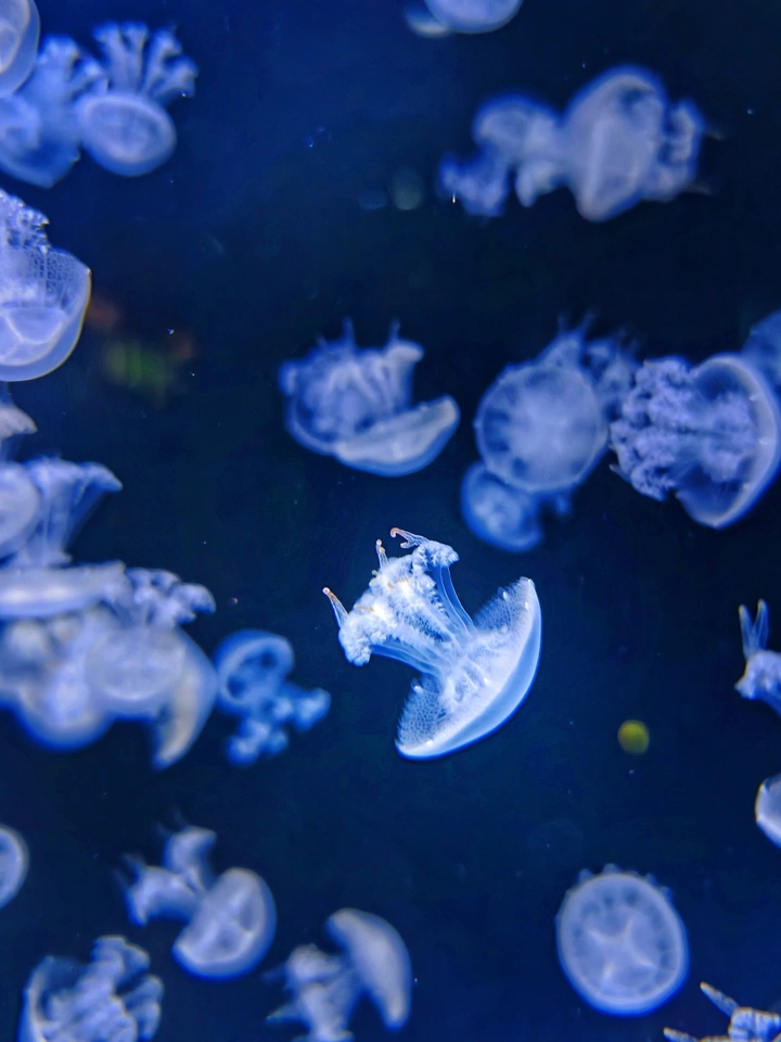 深蓝如幕,水母是坠落的星子。 半透明的伞翼载着细碎的光,在幽暗中舒展、漂浮,像一场无声的梦境。它们不急不缓,用柔软的姿态,把深海的孤独,酿成了温柔的诗。 每一次翕动,都像是在对世界说:别急,慢慢来。