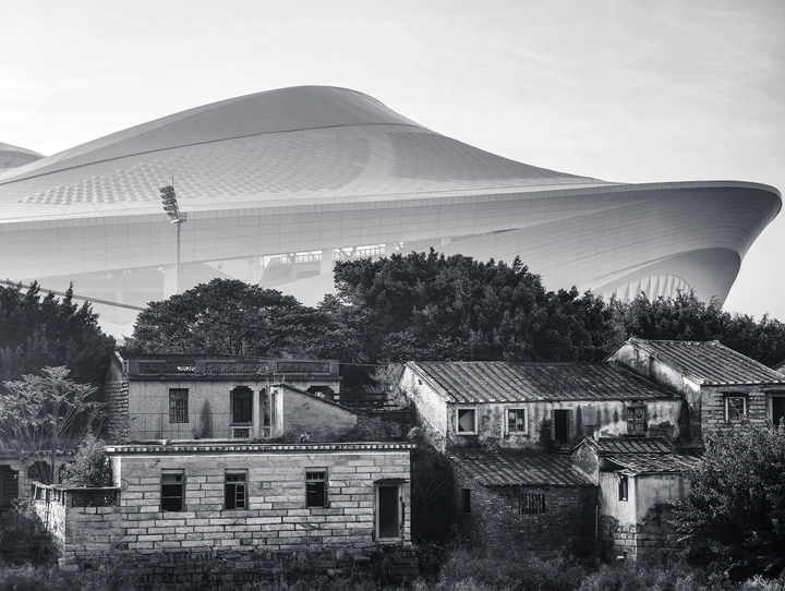 晨雾未散,河面上的倒影还在轻轻摇晃,那艘巨大的“UFO”便悄然降临在村庄的上空。它光滑的穹顶在天光下泛着冷冽的光泽,与脚下斑驳的石屋、褪色的瓦顶形成尖锐的对视。 我站在岸边,像一个误入科幻片场的旁观者,看未来的造物与古老的村落,在这片被遗忘的土地上,完成一场沉默而震撼的相遇。