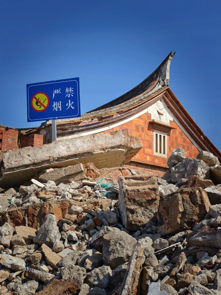 燕尾脊还在, 红砖墙还在, 但家的轮廓,已被碎石掩埋。 “严禁烟火”四个字, 不是警告, 是对一段烟火人间的告别。