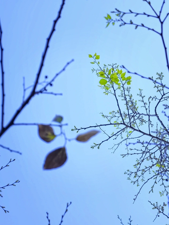 冬的余温还未散尽,春的信使已悄然爬上枝头。 枯褐的残叶在风里轻轻摇晃,嫩绿的新叶却已舒展,在澄澈的蓝天里舒展着新生的力量。 新旧交替,枯荣共生,这便是季节温柔的更迭。