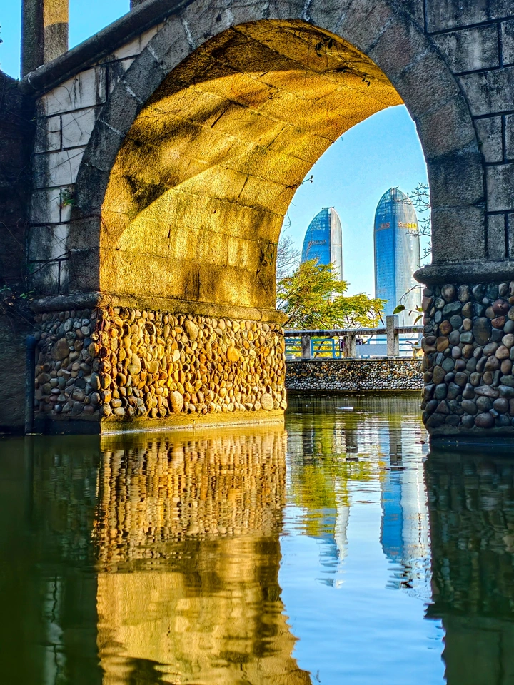 晨光照彻石拱桥, 一池春水漾金涛。 稚手轻拨涟漪起, 龟群静卧晒春袍。 古榕垂影,新绿漫岛, 旧石与新厦同框, 把闽南的温柔, 都揉进这方碧绿中。