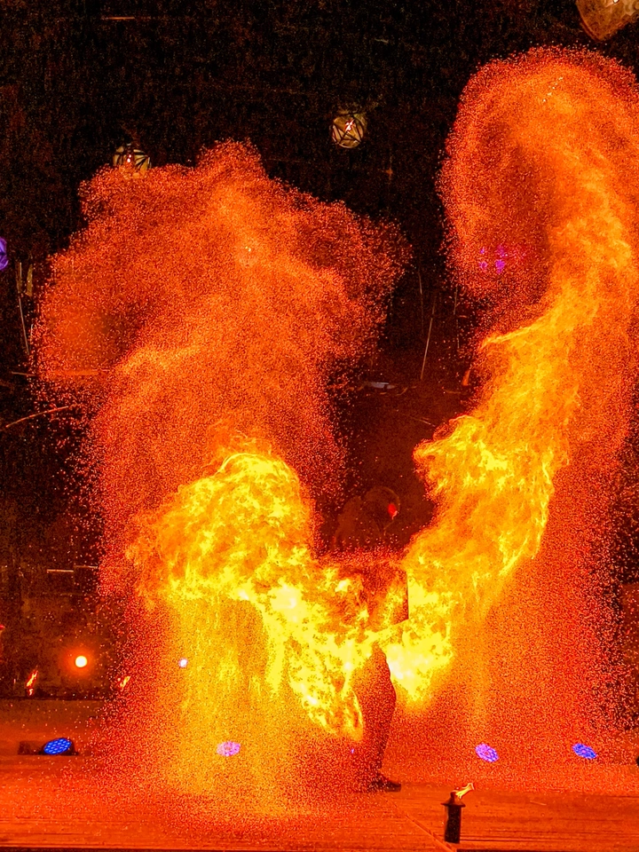 暗夜为幕,赤焰为魂。 火舌在身侧翻涌成浪,金红的星屑在风中炸开,像把整个黄昏揉碎,又掷回人间。 舞者在光与热的中心,与古老的力量共舞,每一次振臂,都是对生命最炽热的礼赞。 这一瞬,所有的喧嚣都被火焰吞噬,只剩心跳与光同频。