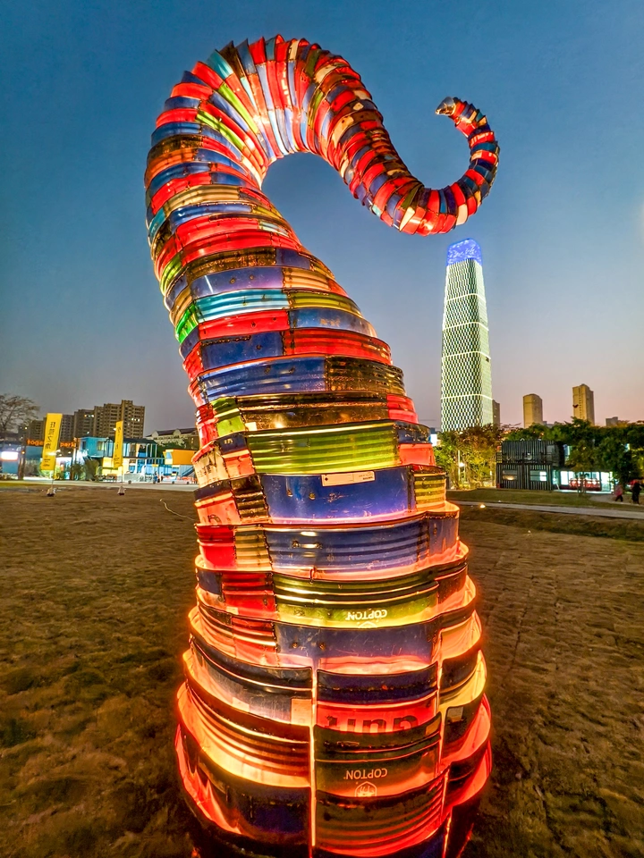 黄昏把天空染成温柔的蓝, 一只巨大的彩色尾巴从泥土里破土而出。 它由无数金属桶片叠卷而成, 红、蓝、绿、金的色块在夜色里流转, 像把整个城市的霓虹都揉进了这一道弯。 身后的高楼静静矗立, 而它却以最张扬的姿态, 在空地上划出一道自由的弧线。 这是工业废料的重生, 也是城市脉搏里跳动的艺术心跳。