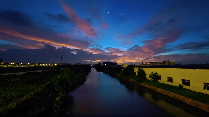 天刚破晓,朝霞已铺满天际,云朵被烫成绯色,河水漫着鎏金。小舟悠悠行在光里,划开的涟漪揉碎朝霞。