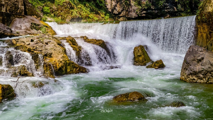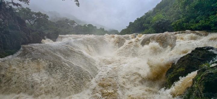 骤雨倾盆,催涨银链坠潭。湍急水流漫过石滩,裹挟泥沙,似黄绸狂舞。四周青山笼烟,与汹涌瀑流相衬,平常精巧之景,因雨生威,尽显天星桥喀斯特地貌间,水势骤变的震撼张力 。