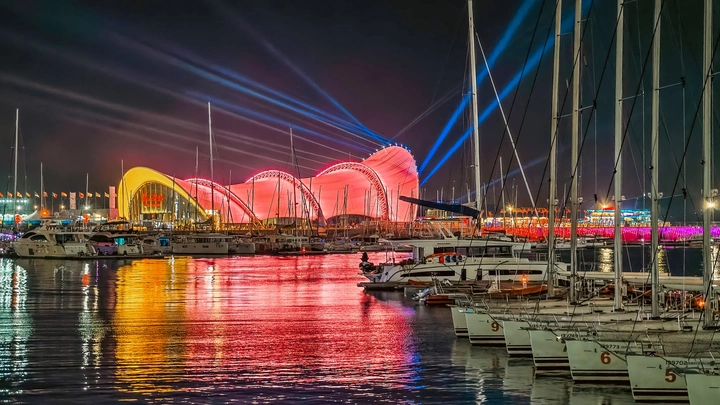 青岛奥帆中心的夜,是浮湾漾开的浪漫絮语。光影泼洒在建筑穹顶,如揉碎的霓虹绸缎,帆船桅杆剪影错落,与波光共谱夜曲,每缕涟漪都藏着山海城的温柔。