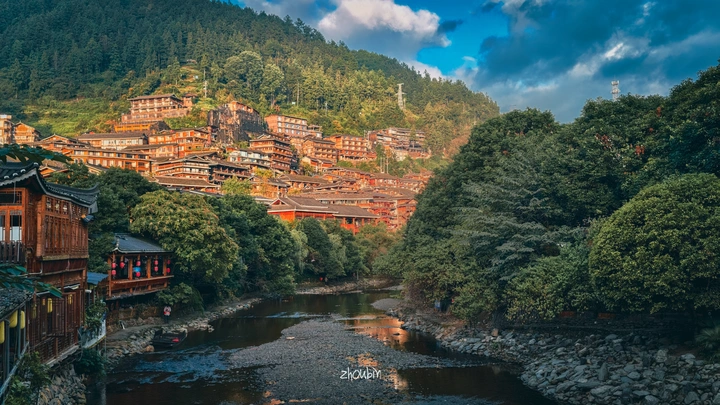 吊脚楼依山而建,像岁月堆叠的积木,藏着苗族人家的烟火故事。阳光给楼宇镀上暖金,和翠绿山林、蜿蜒河道相融,每一缕光、每一片瓦,都在诉说这里的传承与宁静。