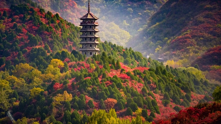 青灰的七层飞檐塔,如一枚玉簪斜簪在济南红叶谷的秋鬓上。佛家“七级浮屠”的典故凝在塔檐的铜铃里,而漫山的黄栌已把山峦烧成赤霞——红焰裹着翠柏,金风揉碎丹枫,层林似被天地打翻的颜料盘,泼得山谷满目斑斓。 塔上人影轻移,是游人在截取秋光:向下能见绚秋湖的碎金波纹,抬眼是层叠的红浪漫过峰峦,连山风都裹着木叶的暖香。这塔是秋的画框,将济南独有的诗意秋光,框成一轴流动的“层林尽染图”——既有古建的沉静风骨,又有山野的热烈奔涌,让每一缕风都成了秋的信笺。