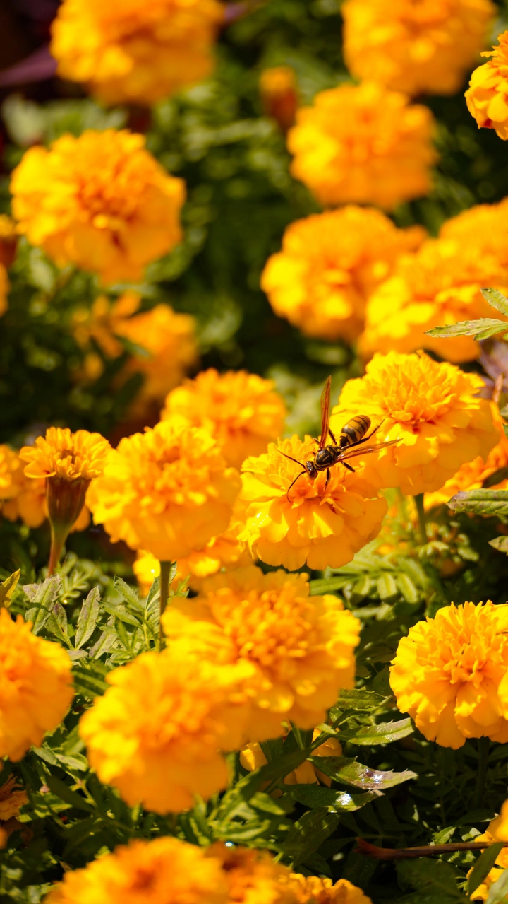 日光把万寿菊酿成一丛丛流动的金箔,瓣间还凝着晨露的碎光——这是秋阳里最热烈的色块,像把整个季节的暖都揉进了花盏。黑黄相间的胡蜂收拢薄翅,细足轻踏在绒软的花心上,触角轻颤着探取蜜意,连翅膀的纹路里都浸着花的甜香。 万寿菊的橙黄本是秋的信使,而蜂的驻足让这帧静物有了呼吸:花叶的簌簌、蜂翼的微振,都裹在暖融融的光里,成了秋日里最鲜活的低语。这是自然写就的短诗,每一片花瓣、每一次蜂的翕动,都是藏在烟火气里的温柔。
