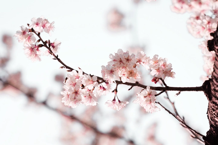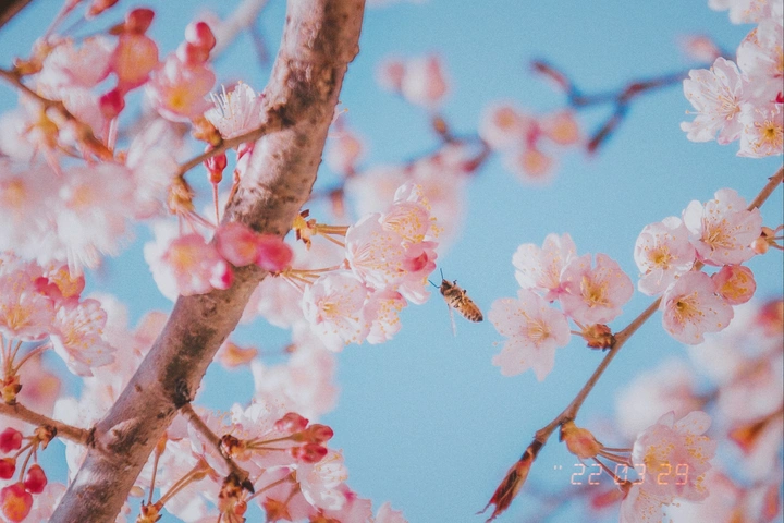 淡粉花簇浸在晴蓝底色里,蜂翼驮着风的碎响,正奔赴下一朵花的邀约。时间在樱瓣上轻踮脚,把花瓣的甜香,都封进这帧短笺里。