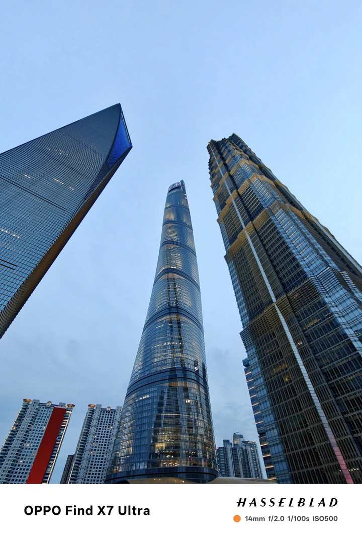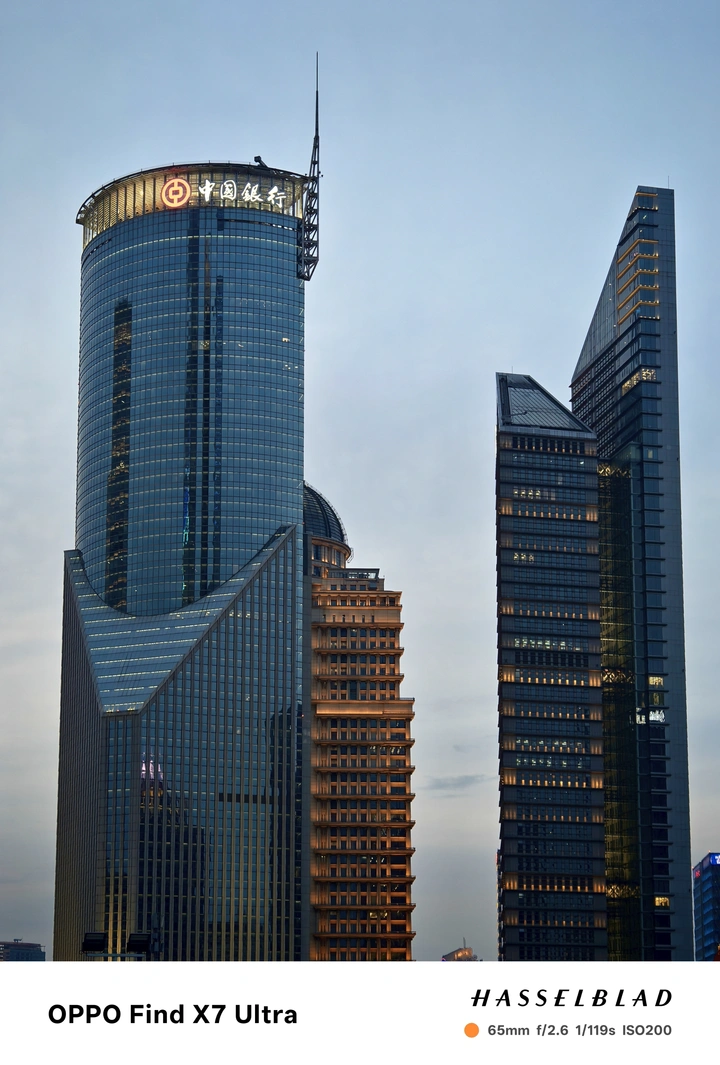 当暮色刚为天空晕染开一层浅蓝,上海陆家嘴的摩天楼群便成了城市的“垂直森林”。 第一张图里,上海中心、上海环球金融中心与金茂大厦以锐角刺破天际——玻璃幕墙是它们的“叶片”,渐次亮起的灯光是叶脉里流动的光河。上海中心的螺旋轮廓在蓝调天幕下泛着温润的金属光泽,环球金融中心的“开瓶器”尖顶嵌着一抹冷蓝,金茂大厦的网格外立面则像被夕阳镀了层暖金,三者以极具张力的几何姿态对峙又共生,把城市的野心与精致都写在建筑线条里。 第二张图的视角更柔,中国银行大楼的弧形玻璃幕墙上,“中国银行”的标识亮着暖黄,与旁边棱角分明的现代建筑形成刚柔反差;中间那栋带着复古肌理的楼体,在周遭的玻璃丛林里像位低调的绅士,暖光从窗格里漏出来,给冷峻的建筑群添了几分生活的温度。 这是属于城市的“呼吸时刻”:白日的喧嚣尚未完全退场,夜晚的霓虹刚刚苏醒,摩天楼的玻璃幕墙映着浅蓝的天,灯光是城市的脉搏,在建筑的骨骼里轻轻跳动。OPPO Find X7 Ultra的镜头抓住了这瞬间的平衡——既有超广视角下建筑的恢弘张力,也有长焦里细节的细腻温度,让钢筋水泥的森林,也有了蓝调时刻里的柔软呼吸。