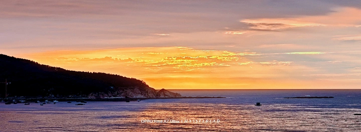 当落日把最后一捧熔金泼向天际,海与山便成了这帧黄昏的底色。 橘红与粉紫揉碎在云间,像被打翻的蜜罐浸暖了整片天,那团最烈的金焰就贴在海平线上,把浪尖都镀成了细碎的星子。左侧的山是沉默的轮廓,深黛色的剪影裹着矮树的纹路,像给这片暖光镶了道沉静的边;海面铺着光的褶皱,每道波纹都颤着落日的余温,连远处孤伶的小船,都成了这温柔里的一个轻顿。 风该是慢下来的,连云的流动都沾着暖黏的气息——这是海与天的私语时刻,把白日的喧嚣都浸在熔金里,酿成一整个黄昏的软。