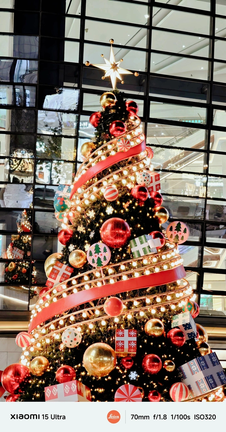 漫步商场时,一眼就被中庭这棵巨型圣诞树抓住了视线。红金交织的装饰搭配着蜿蜒的灯带,在黑色玻璃幕墙的映衬下,像是把圣诞童话搬进了现实。饱满的红绸带从树顶盘旋而下,缀着的大颗红金彩球、可爱的圣诞主题挂饰,每一处细节都透着精致。树顶的星星灯一亮,暖黄的光晕漫开,和周围玻璃反射的光影交织在一起,氛围感直接拉满。伸手触摸到松枝的纹路,听着商场里的圣诞歌,突然就懂了人们偏爱圣诞的原因——是平凡日子里,被这些闪闪发光的美好瞬间治愈的感觉呀。