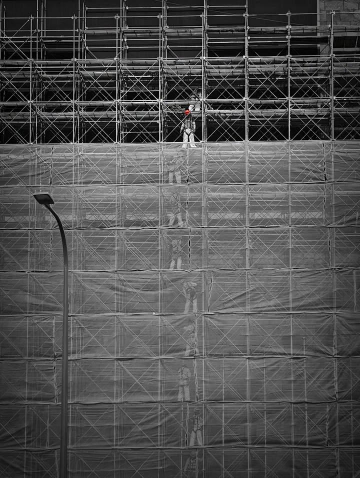 黑白影调里,城市建设的骨架以几何网格的形态铺展,脚手架的金属线条纵横交错,如一张巨大的织网笼罩着建筑立面,冷硬的工业质感在画面中层层叠叠。薄质防护网依附在钢架上,褶皱与网格的纹理交织,让冰冷的建筑结构多了几分柔软的肌理层次,左侧的路灯杆孤直矗立,成为画面里唯一的垂直呼应元素。 画面视觉焦点落在钢架间隙中那抹醒目的红色——是建筑工人安全帽的色彩,在黑白的沉寂里撕开一道鲜活的缺口。工人的身影渺小却坚定,在纵横的钢架间成为“织网”的核心,他的存在让冰冷的工业场景有了温度与灵魂。这帧画面捕捉到城市生长的瞬间,钢架是城市的骨骼,而劳动者是赋予骨骼生命力的手,红芒一点,既是安全的标识,也是城市建设中最动人的人文注脚。