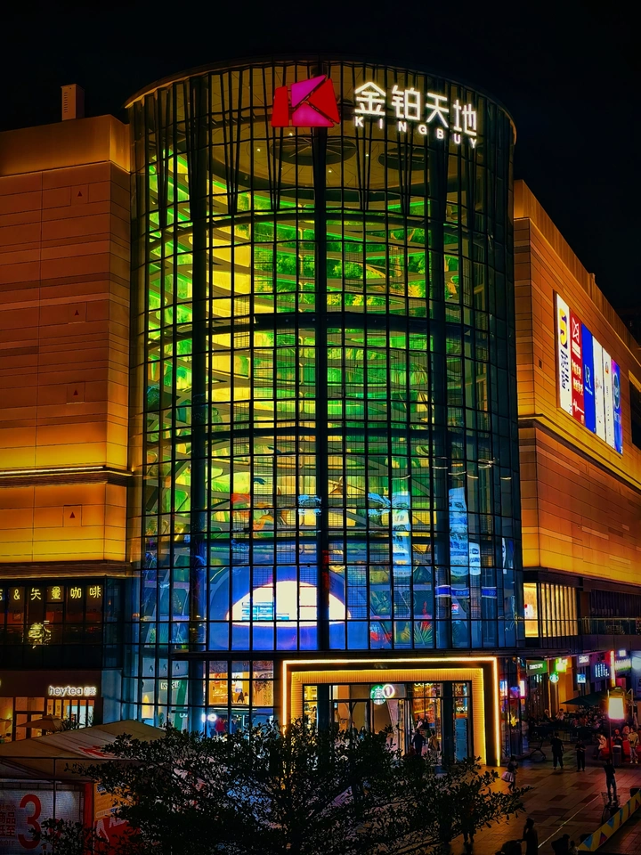 金铂天地的玻璃幕墙像一块被点亮的棱镜,把霓虹揉成深浅不一的绿与蓝。路过的人在光里走成流动的星子,整座楼都成了城市的夜之眼。