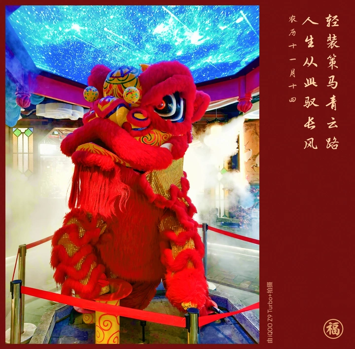 这帧画面里,藏着中式浪漫的极致表达。红绸围栏圈住的不仅是舞狮的吉地,更是一份独属于新春的仪式感。升腾的白雾漫过狮爪,似云端漫步;脚下的彩柱刻着缠枝纹样,承接着狮跃的力量。星空作幕布,红狮为主角,传统民俗的厚重与浩瀚星河的空灵相融,恰如我们期许的新年,既有脚踏实地的笃定,也有仰望星空的浪漫。