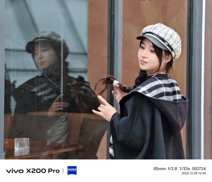 玻璃映出的影,和手边绕起的发尾,凑成了冬日街头独一份的慵懒与随性,在城市的玻璃幕墙边,和自己的影子玩一场温柔的互动,时光也跟着慢下来几分。