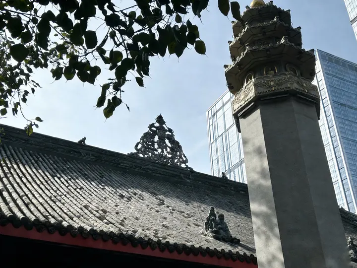 红墙黛瓦的檐角,正接住成都春日的柔光。大慈寺的屋脊上,端坐的瓦当仙人守着千年烟火,鎏金的经柱在树影里流淌着梵音。 巷口的竹影斜斜扫过“成都味道”的门楣,廊下红黄相间的祈愿幡,被游人的笑声轻轻拂动。墙角的曼陀罗花静静垂着,像藏着一段未说尽的禅意。 古刹与高楼在此处温柔相逢,一碗盖碗茶的热气里,是老成都最熨帖的日常。