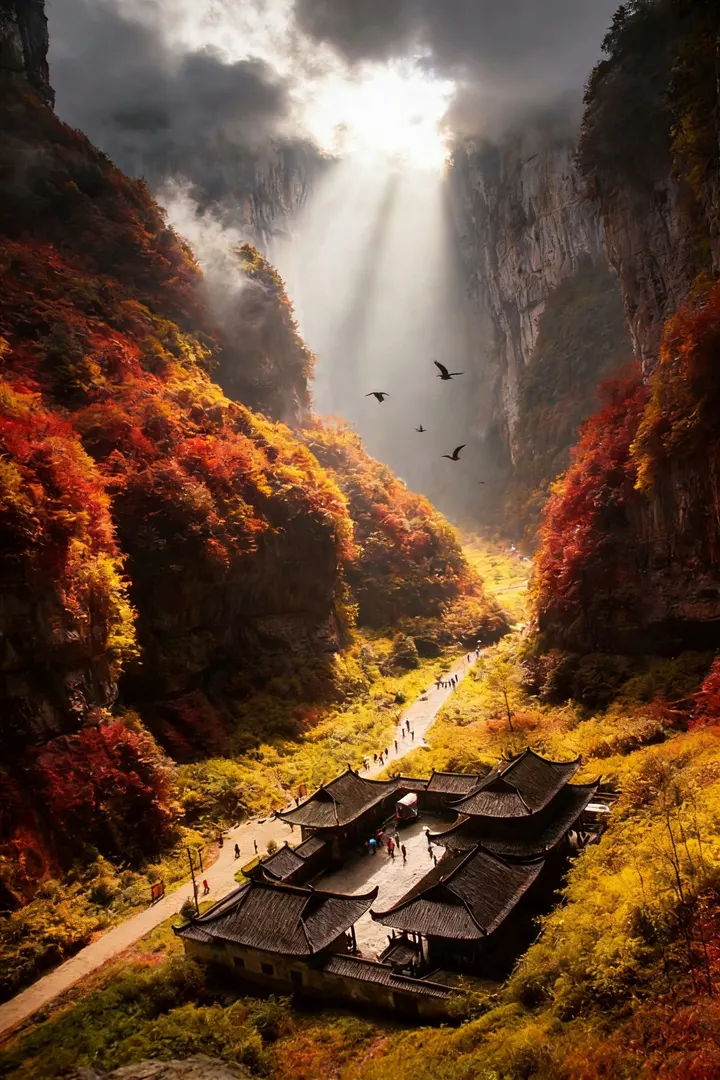 武隆峡谷漫染深秋意,光影裁云入峦间,红叶缀崖染层林,飞鸟振翅穿岚烟。 清辉漫过嶙峋山石,明暗交织间藏尽天地灵秀,风拂叶动落秋声,禽鸟翩跹添生气,一帧皆是神作,尽揽武隆深秋的磅礴与诗意。