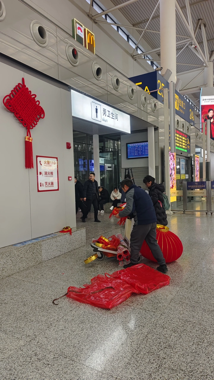 春节的脚步越来越近,进入虹桥火车站,工作人员已经开始布置场景了,大红灯笼、中国结,中国年味从此刻开始了。